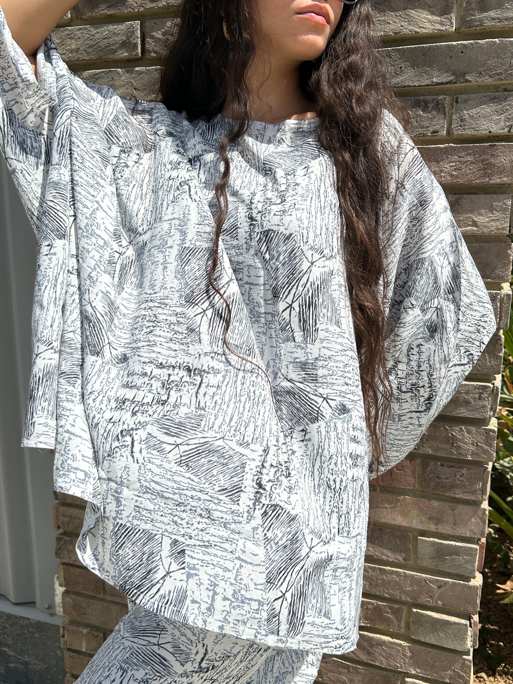 Contemporary abstract printed linen set in soft neutral tones