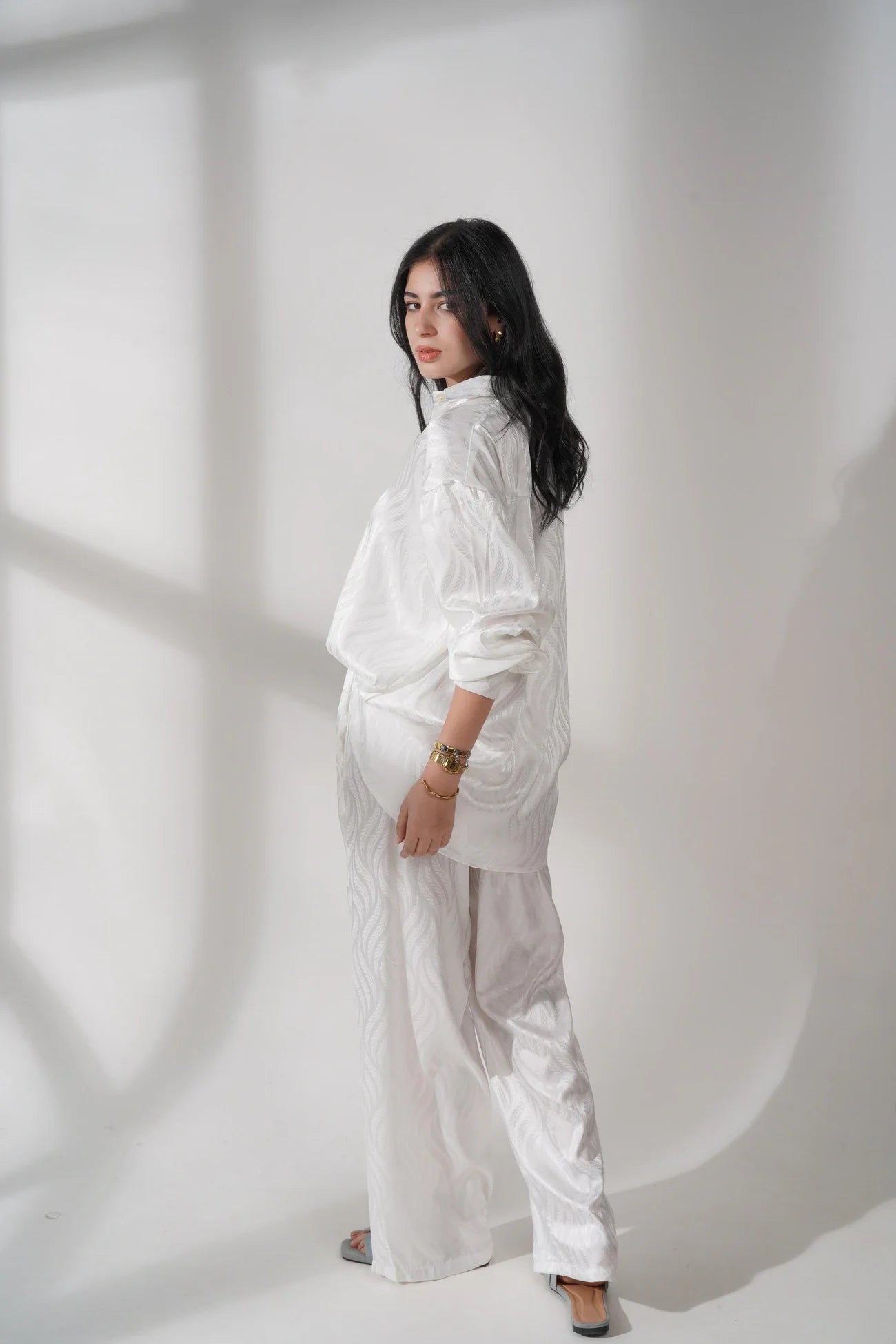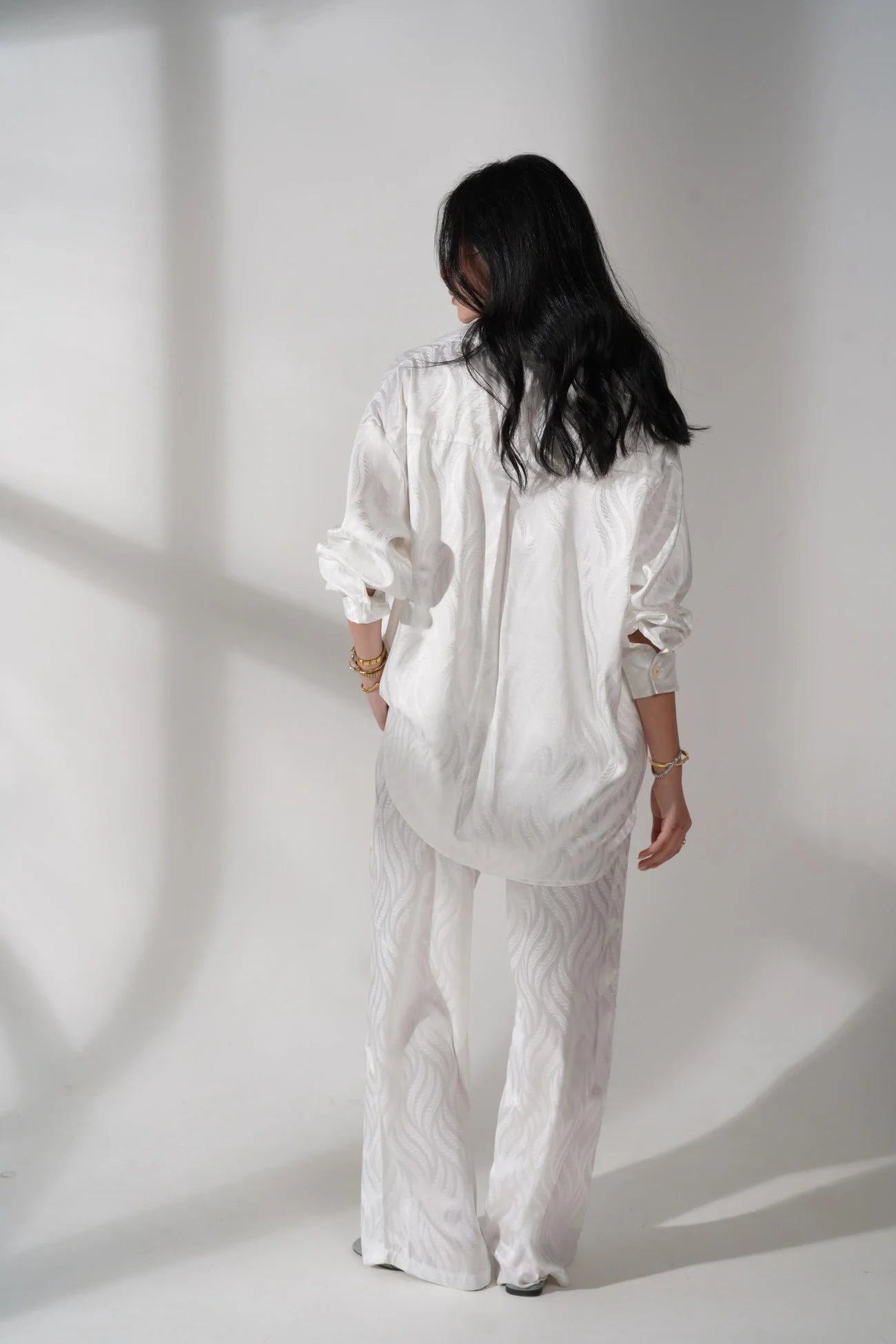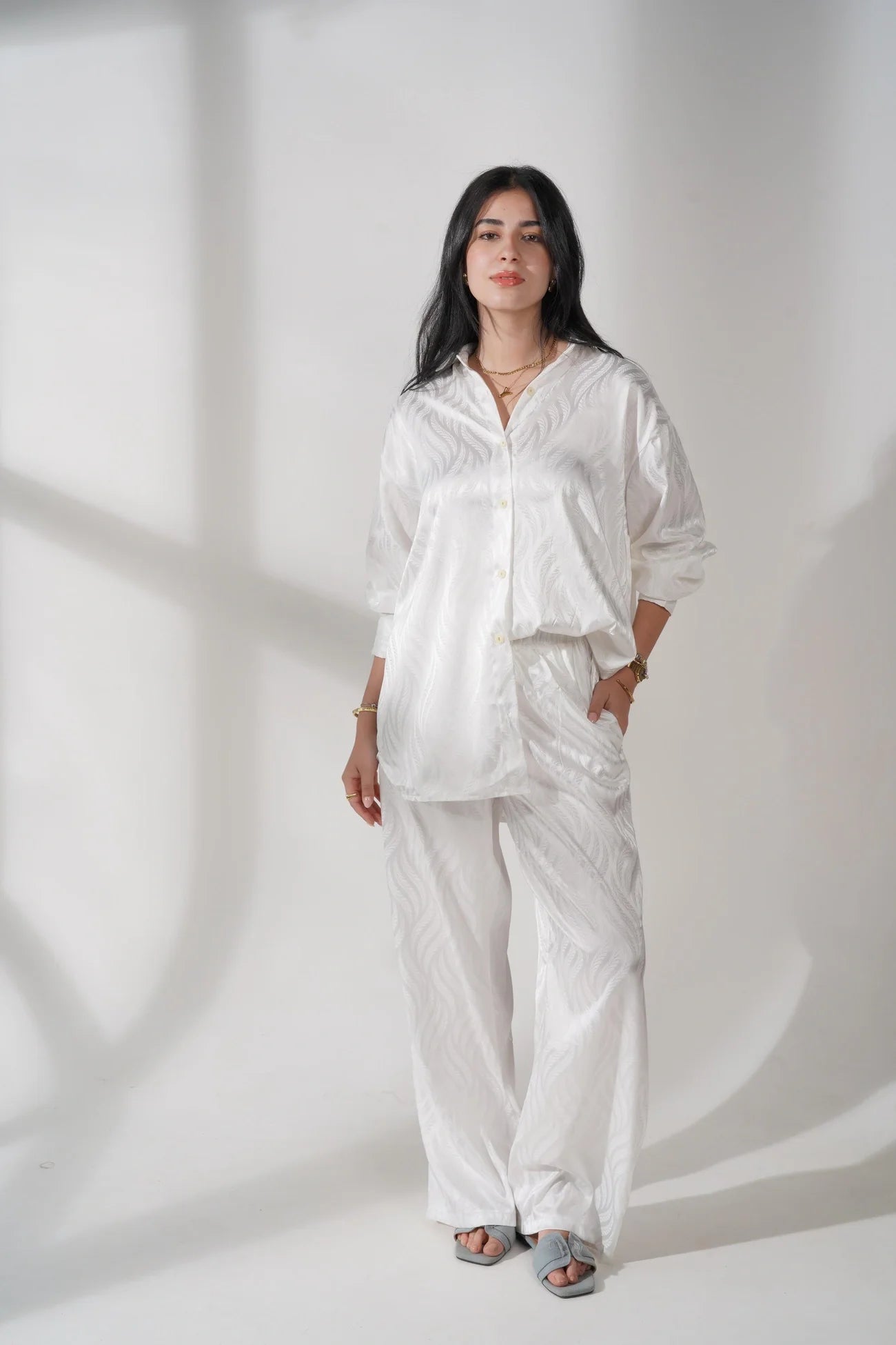 The Seren Set is a soft satin statement in off-white, detailed with a barely-there pattern that catches light like moon shimmer. Designed for movement, it shifts easily from beach sunsets to rooftop nights.Flowy silhouette with clean lines